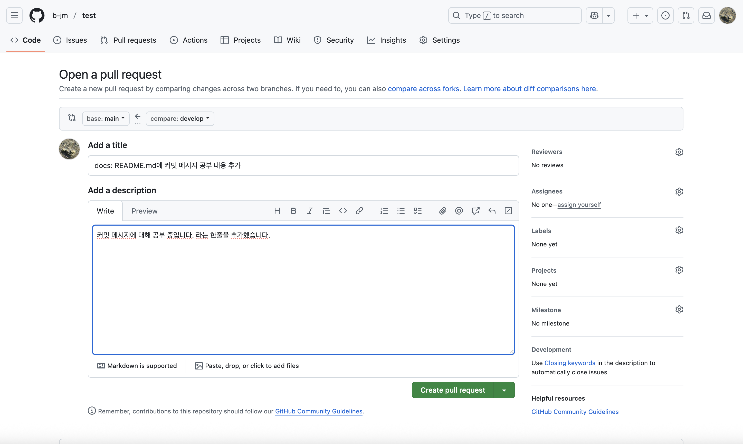 이 버튼은 말 그대로 "이제 GitHub에 Pull Request를 열 준비가 되었다!"라는 뜻이에요.