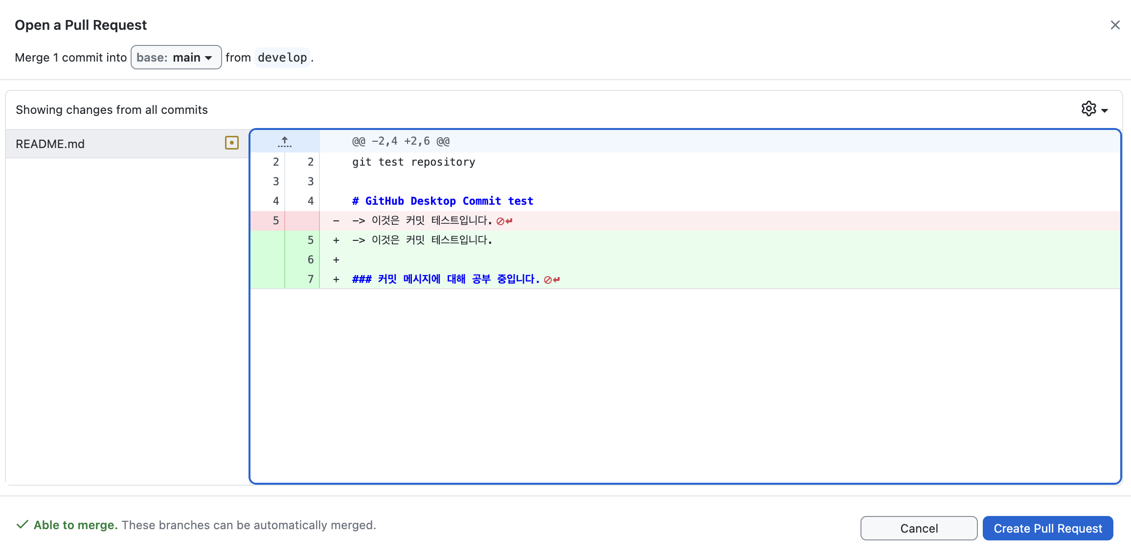 Pull Request를 만들기 전에, GitHub Desktop에서 변경된 내용을 미리 확인할 수 있습니다.