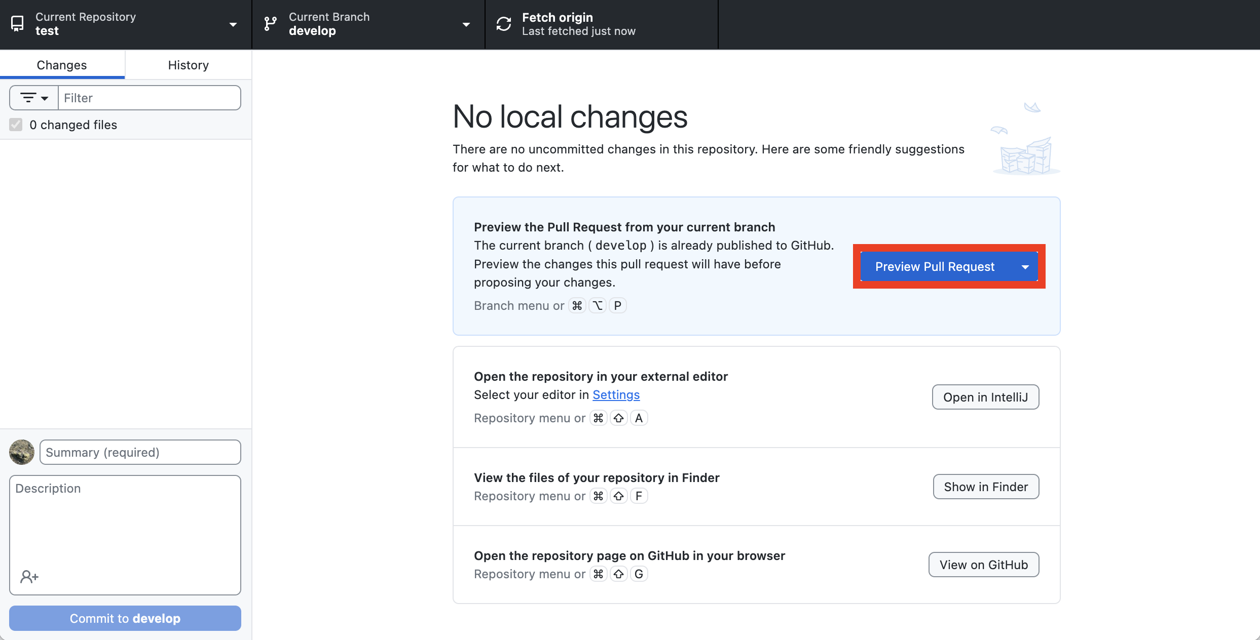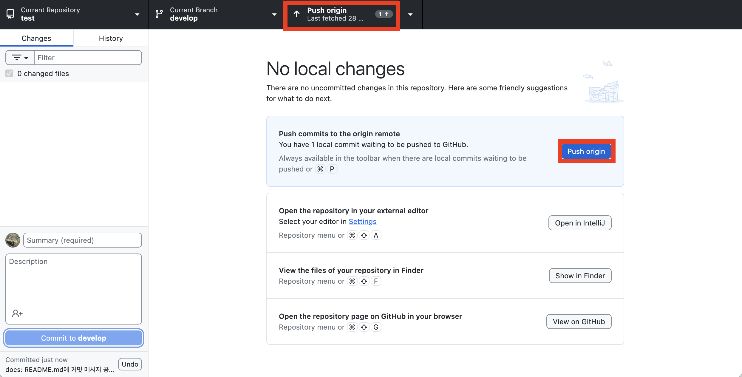 작업한 파일을 저장하고 나면 GitHub Desktop 화면 왼쪽 하단에 Commit to develop 버튼이 보입니다.