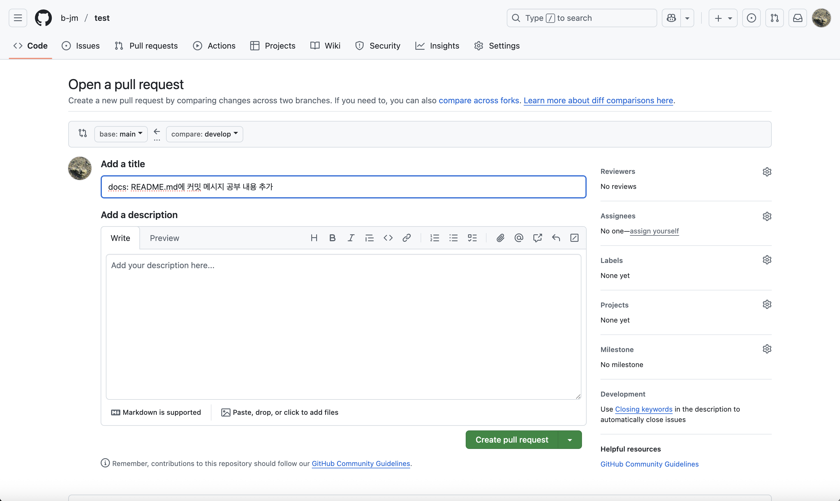 이 버튼을 클릭하면, 두 브랜치(main과 develop)를 비교해서